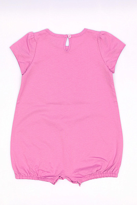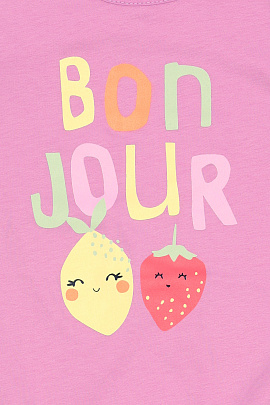 Песочник для девочки из мягкого трикотажа. Горловина круглая, оформлена окантовкой. Застежка на спинке на одну пуговицу и спереди по ножкам на кнопки. На полочке выполнена шелкография в виде фруктов и надписи - приветсвие.