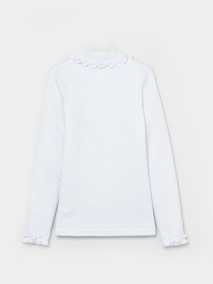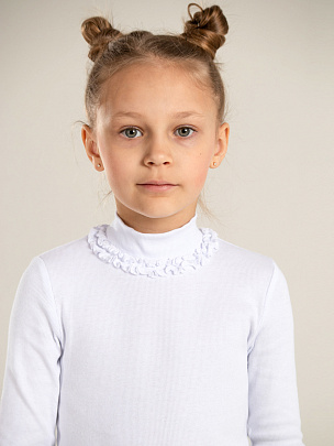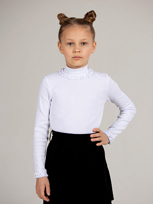 Водолазка из кашкорсе с эластаном. Модель с длинными рукавами и воротником-стойкой. По шву притачивания воротника и шву подшивки низа рукава эластичной строчкой настрочены рюши из основного полотна. Края рюши обработаны микрооверлоком.