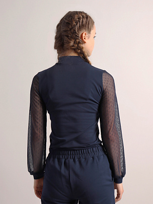 Водолазка для девочки с длинными рукавами и воротником-стойкой. Рукава из сетки с манжетами из кулирки. Полочка с имитацией застежки на пуговицы.