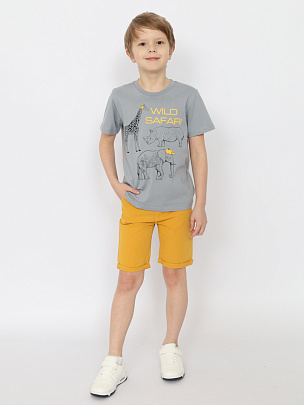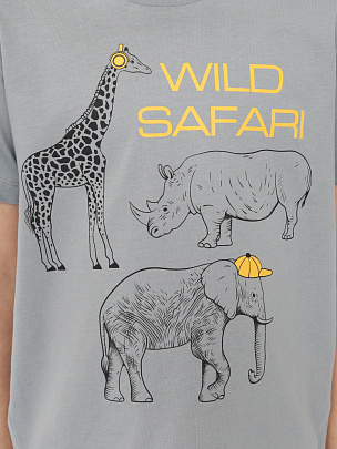 Футболка с коротким рукавом. Горловина круглая, обработана узким воротником из полотна с эластаном. Перед оформлен принтом.